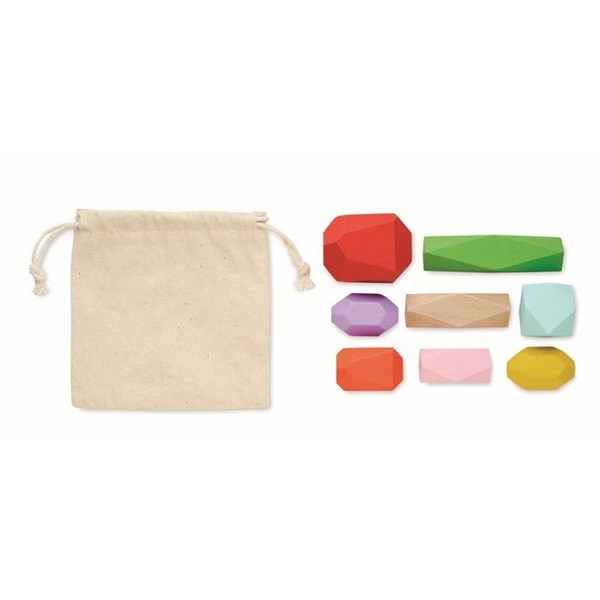 Sada 8 farebných drevených stohovacích ''kameňov'' v bavlnenom sťahovacom vrecku.
