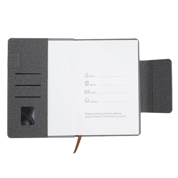 Elegantný linajkový zápisník s vreckom na vizitky a magnetickým zatváraním. Veľkosť 14,6 x 21,6 cm.
