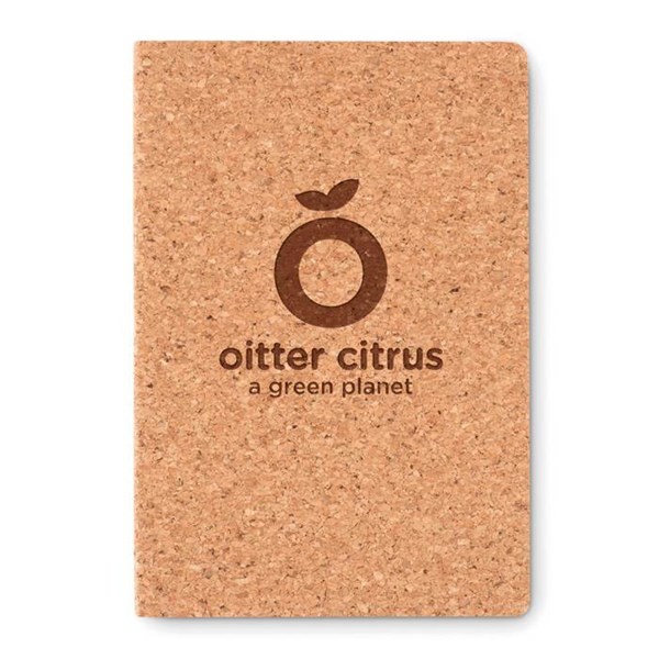 A5 zápisník, 96 linajkových stránok, mäkké dosky s korkovým povrchom.